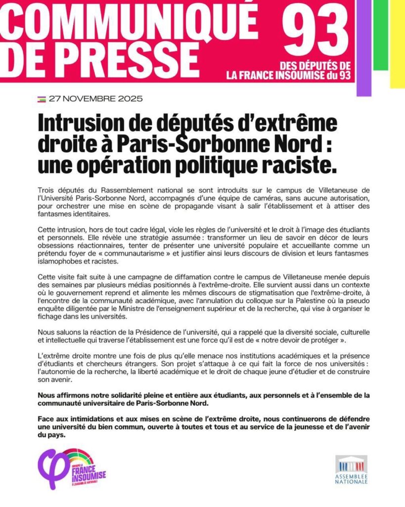 Aujourd’hui, un seuil est franchi : trois députés lepénistes se rendent sur place pour filmer, sans autorisation, sans consentement. Une intrusion en violation totale de la sérénité de l’espace universitaire et des droits des personnes. Une descente répugnante, menée par de minables petits agitateurs.