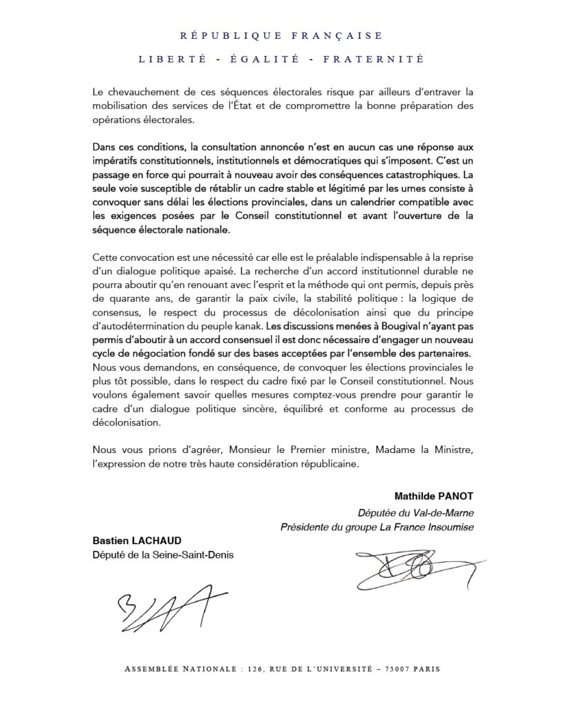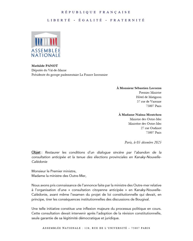 Avec Mathilde Panot, nous alertons officiellement le gouvernement sur sa « consultation anticipée » en Kanaky-Nouvelle-Calédonie qui constitue une nouvelle dérive anti-démocratique. Elle n’a aucune légitimité.